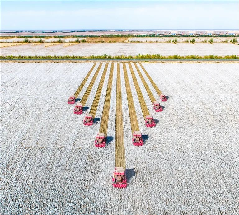 在昌吉國家農(nóng)高區(qū)棉田里,大型采棉機穿梭其中,有序采收棉花?! ≠Y料圖片