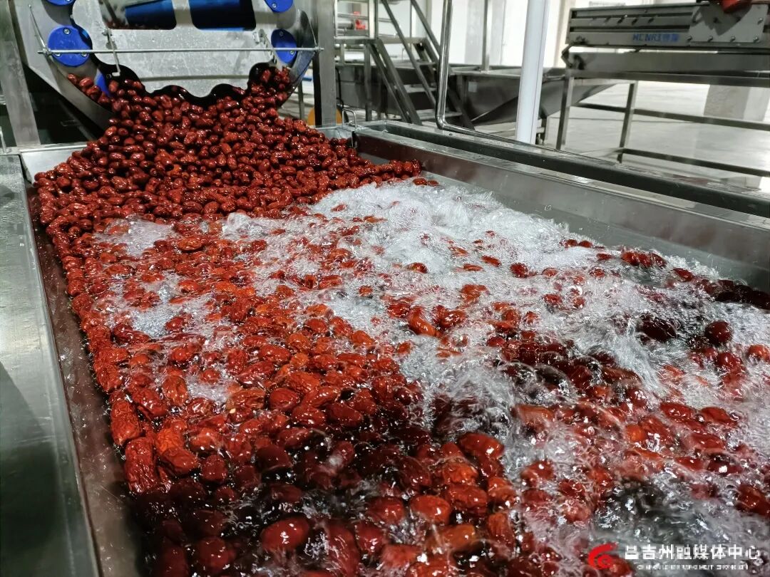 1月27日,在新疆綠谷數(shù)智食品產(chǎn)業(yè)園生產(chǎn)車間,自動化清洗設(shè)備正對新鮮紅棗進行分揀清洗。記者劉茜 攝