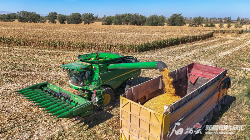 2024年收獲季,新疆呼圖壁縣五工臺鎮(zhèn)龍王廟村,農(nóng)機(jī)手駕駛收割機(jī)收獲玉米。陶維明?攝